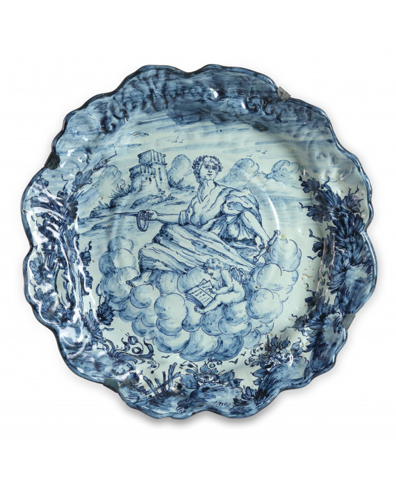 Piatto da parata in maiolica dipinta in blu con allegoria della vittoria, sul retro serto vegetale con firma. Albisola, sec. XIX. Diam. cm36