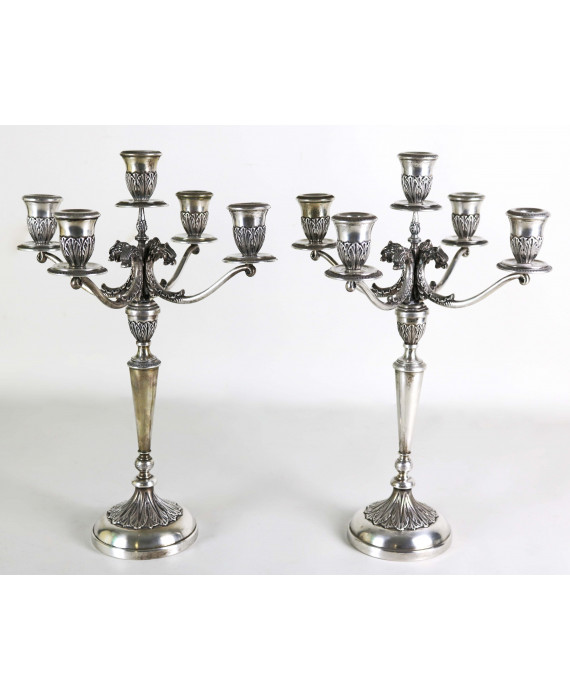 Coppia di candelabri a cinque fiamme in argento 800, lavorati con teste di grifoni e palmette. Alt. cm44. Peso tot. gr. 2600