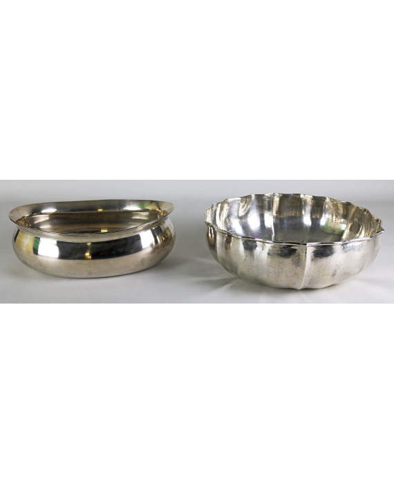 Lotto di due centrotavola in argento 800: uno ovale a corpo liscio ed uno tondo con bordo mosso. Peso tot. gr. 1820 (lievi ammaccature)