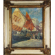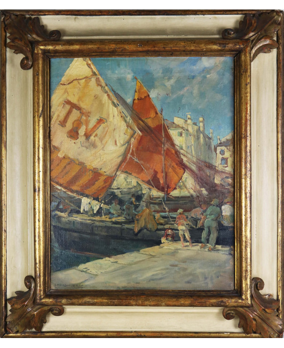 Molo con barche e pescatori, con cornice