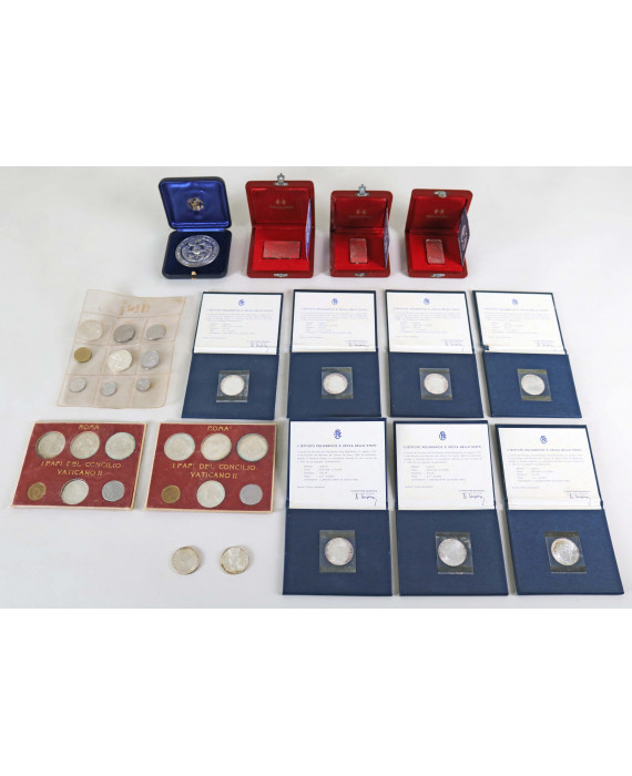 Lotto di numerose monete e divisionali: una medaglia in argento 800 dell'Università degli Studi di Pisa, tre lingotti in argento 925, sette monete in argento 835 commemorative del V centenario della nascita di Michelangelo Buonarroti, due divisionali Roma i Papi del Concilio Vaticano II, due monete da lire 500 ed un divisionale della Zecca di Roma del 1970. Peso tot. dell'argento gr. 520
