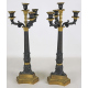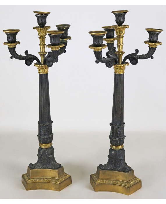 Coppia di candelabri a quattro fiamme in bronzo brunito e dorato con braccia a voluta e fusto scanalato. Francia, sec. XIX. Alt. cm55 (mancante di un bicchierino)