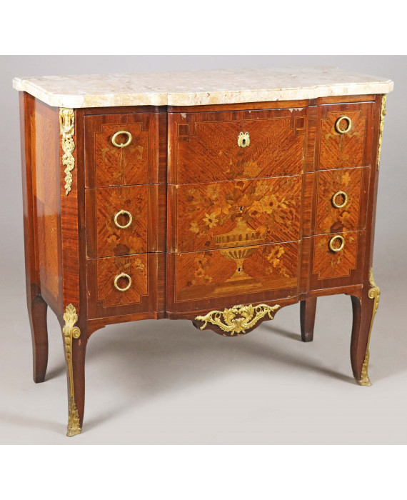 Comò a tre cassetti impiallacciato in legno di mogano ed intarsiato con vasi fioriti, applicazioni in bronzo dorato e lavorato a volute vegetali, gambe mosse, piano in marmo. Francia, sec. XIX. cm91x100x45 (piccole mancanze all'impiallacciatura)