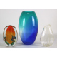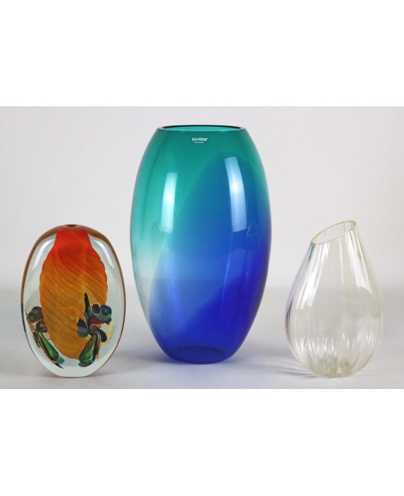 Lotto di tre vasi in vetro: uno di Murano a fondo verde e blu, firmato Barbini, uno monofiore policromo firmato sul fondo e datato 1998 ed uno trasparente di Murano con inclusioni dorate, firmato Seguso. Alt. cm35/22/23