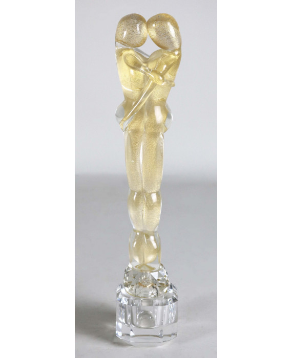 Scultura in vetro trasparente di Murano con inclusioni dorate, raffigurante amanti. Alt. cm37