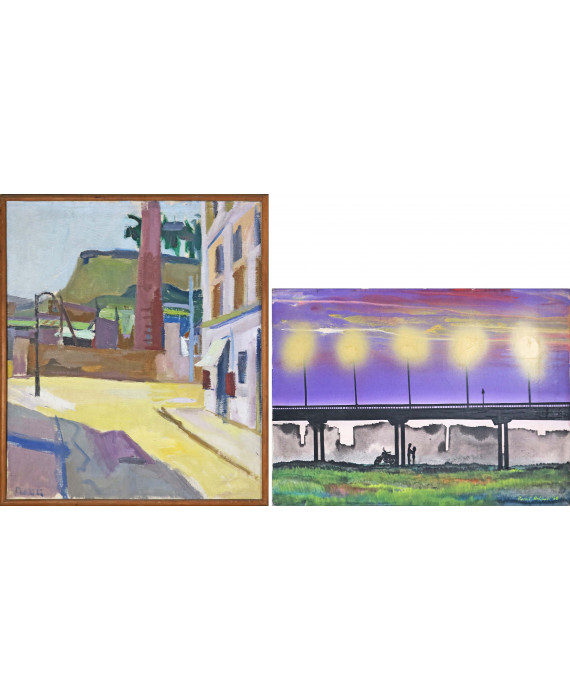 Lotto di due dipinti: Piero Antinori, sec. XX. Amore in periferia, 1968. Olio su tela. Firma e data in basso a destra, sul retro timbro dell'atelier dell'artista. Aldo Natili (1913-1975). Interno con paesaggio dalla finestra. Olio su tela. Firma in basso a sinistra, sul retro tiolo ed etichetta della Galleria del Secolo, Roma, con cornice