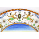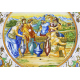 Piatto da parata in maiolica con tesa dipinta a grottesche e centrale raffigurante Abramo e il Re Melchisede, marcato sul fondo in blu Molaroni Pesaro. Diam. cm35 (alcuni difetti di cottura)