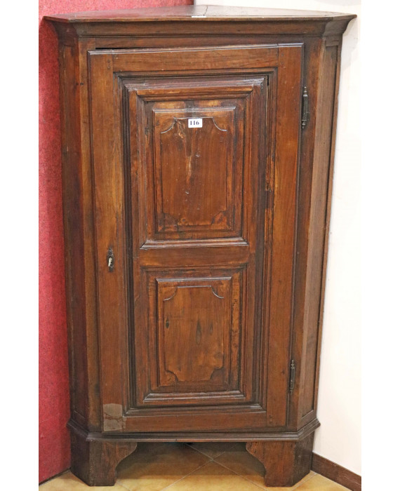 Angoliera in legno di noce, uno sportello riquadrato con all'interno ripiani e specchio superiore. Italia, sec. XIX. cm147x58x58