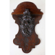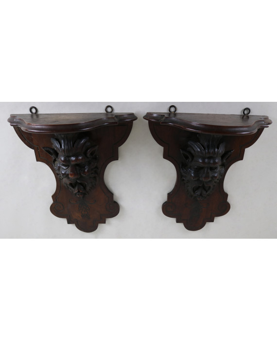 Coppia di mensole in legno di noce con mascherone centrale intagliato. cm42x38x17