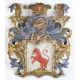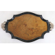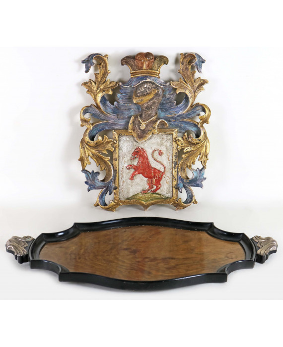 Lotto di un vassoio in legno di noce con cornice ebanizzata ed impugnature rivestite in argento con bolli Firenze, periodo del fascismo, argentiere F.lli Pistolesi ed uno stemma araldico in legno intagliato con leone rampante e cimiero. cm68x40; cm46x40