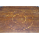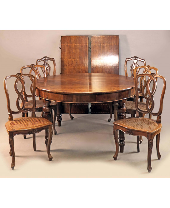 Lotto di un tavolo tondo estensibile impiallacciato in legno di noce decorato con serti floreali completo di due prolunghe e sei sedie in legno di noce (una coppia e un gruppo di quattro) con seduta in paglia di Vienna. Alt. cm80; diam. cm140