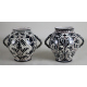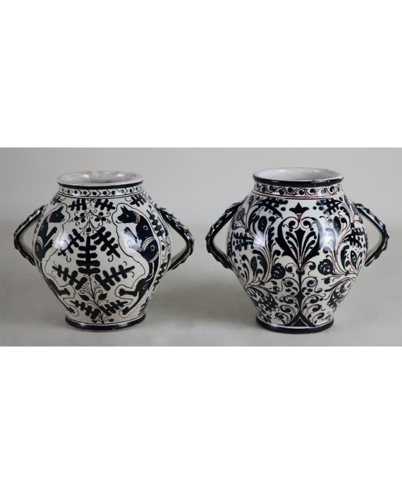 Coppia di vasi biansati in maiolica dipinta con animali e serti vegetali, marcati sul fondo in nero Molaroni Pesaro. Alt. cm19 (filature e lievi scheggiature)