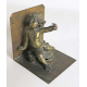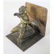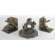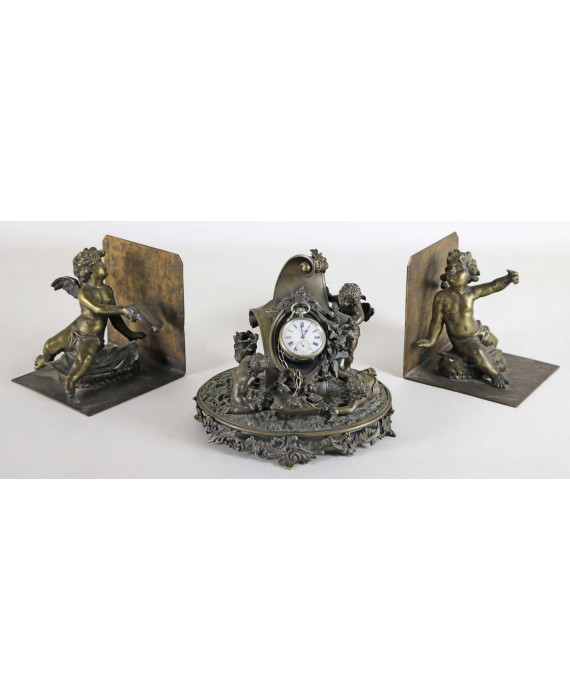 Lotto di tre oggetti in bronzo patinato: un porta orologio da taschino lavorato con putti, nastri e rami fioriti, completo di un orologio di marca Longines ed una coppia di fermalibri lavorati con putti alati. Italia, sec. XIX. Alt. cm19; diam. cm22/alt. cm16(2)