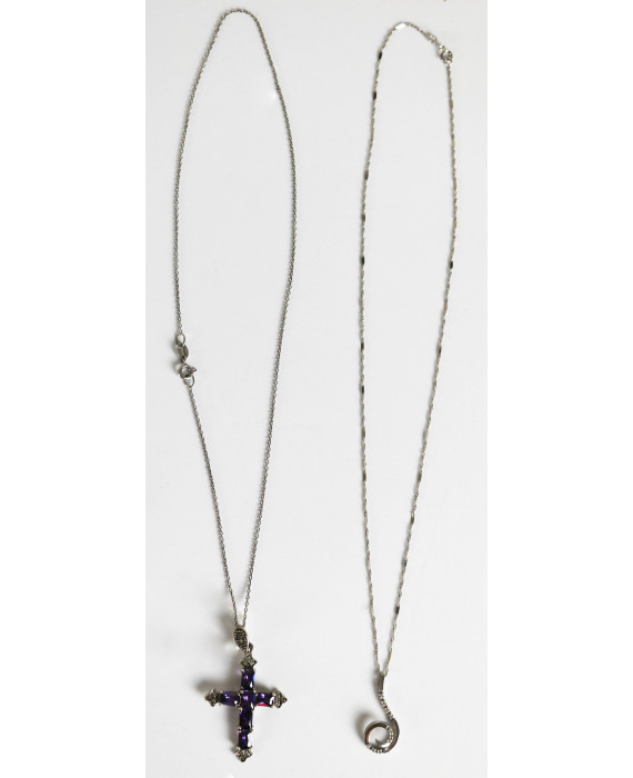 Loto di due collane: una in oro bianco 18Kt con pendente e pietre non preziose ed una in argento 925 con pietre ornamentali a forma di croce stilizzata. Peso tot. dell'oro gr. 3,1. Allegata dichiarazione di autenticità di Federico Perinelli Perito Preziosi e Gems Expert