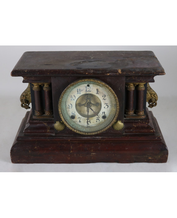 Orologio da tavolo in legno dipinto a finto marmo, semicolonnine laterali, quadrante dipinto, meccanismo marcato WML Gilbert Clock Co Winsted Conn USA. cm25x41x18 (difetti e da revisionare)