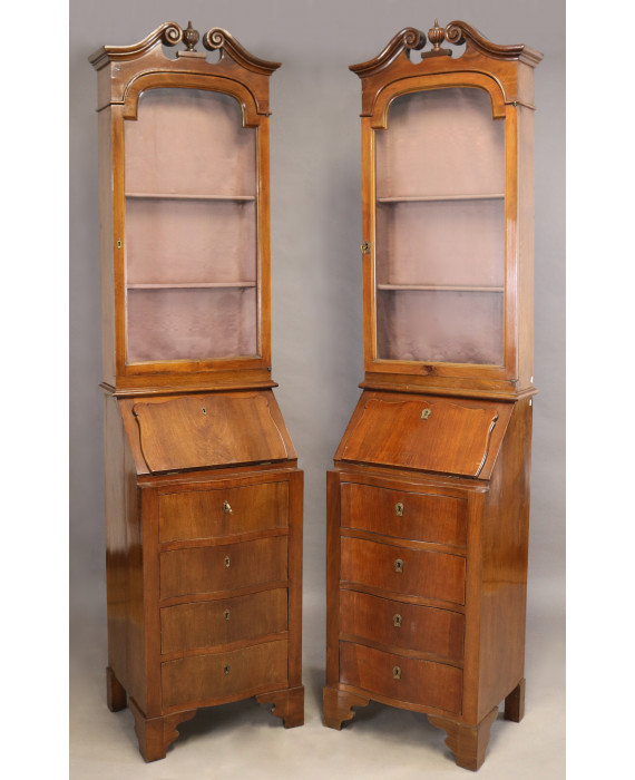 Coppia di credenzine a due corpi impiallacciate in legno di mogano, uno sportello a vetro superiore, calatoia con all'interno due cassettini, quattro cassetti inferiori. cm206x48x36 (lievi difetti)