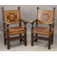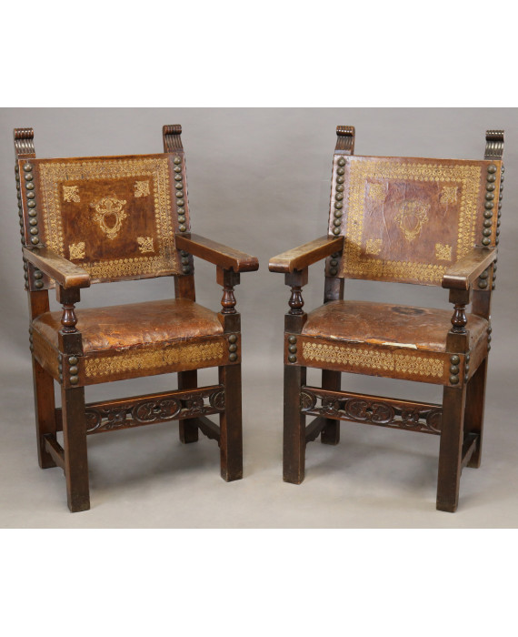 Coppia di poltrone in legno di noce, con seduta e spalliera rivestite in cuoio inciso. Italia, sec. XIX (usure e strappi ala cuoio)