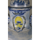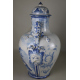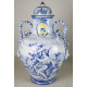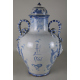 Grande vaso con coperchio in maiolica dipinta in blu con paesaggio con figura maschile e putto alato, stemma araldico coronato superiore, anse a serpente con attacco a mascherone. Savona, inizi sec. XX. Alt. cm56 (scheggiature)