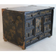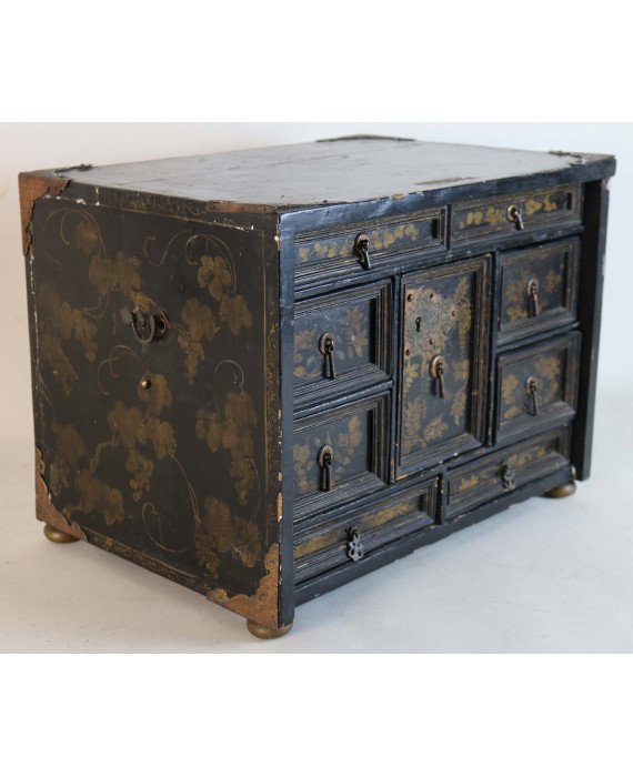 Monetiere in legno laccato nero, dipinto in oro con serti vegetali e fiori, otto cassetti, applicazioni in metallo dorato. Manifattura orientale, sec. XIX. cm32x43x30 (difetti alla laccatura)