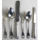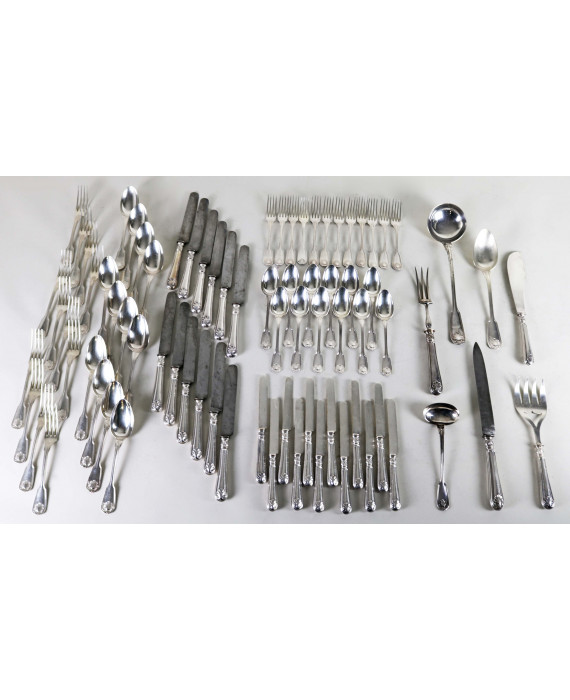 Servizio di posate in metallo argentato marcate Christofle composto da 12 forchette, 12 coltelli, 12 cucchiai, 12 forchette, 12 cucchiai e 12 coltelli medi, sette posate di servizio.
