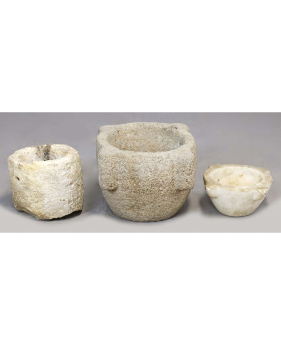 Lotto di tre antichi mortai: uno in peperino e due in marmo bianco. Alt. cm22/18/11