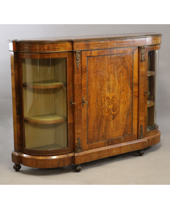Credenza impiallacciata in legno di noce ed intarsiata in legni chiari, uno sportello centrale, due sportelli a vetro laterali. Francia, fine sec. XIX. cm98x150x38