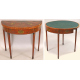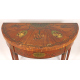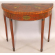 Tavolo da gioco impiallacciato in legno di mogano e dipinto con serti floreali, nastri, spartito musicale e medaglioni con gentildonne ed animali, piano con apertura a libro e panno verde interno, quattro gambe piramidali. Inghilterra, fine sec. XIX. cm74x84x42 (piccole mancanze all'impiallacciatura e lievi difetti)