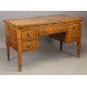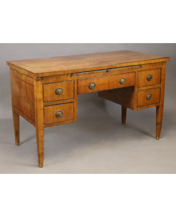 Scrivania da centro lastronata in legno di ciliegio, piano scorrevole, un tiretto, cinque cassetti, gambe piramidali. Italia, sec. XIX. cm80x134x67 (lievi difetti)