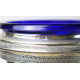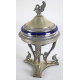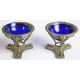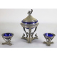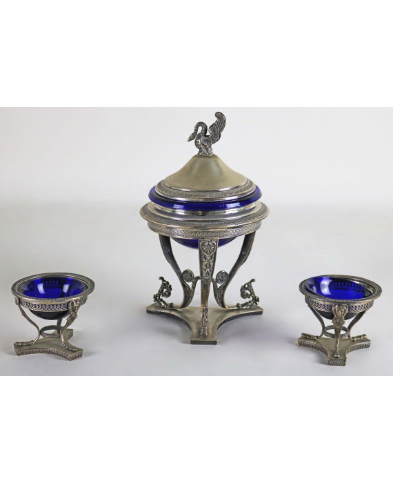 Lotto di una zuccheriera con corpo in argento 800, lavorata con volute vegetali e palmette, contenitore interno in vetro blu, pomolo a cigno ed una coppia di salierine in argento con bolli Italia della fine del sec. XIX. Peso tot. gr. 760