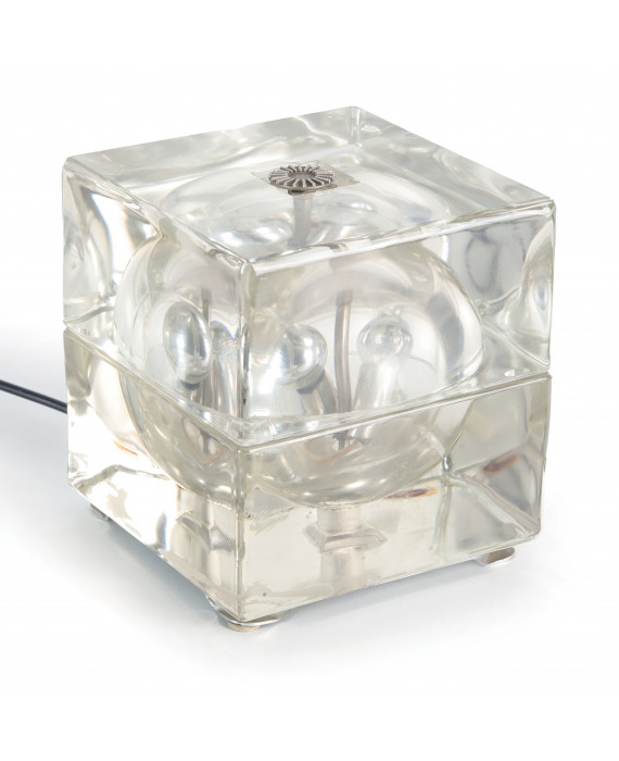 Alessandro Mendini (1931-2019). Lampada da tavolo, modello Cubosfera, in vetro trasparente e satinato con supporto in metallo. Produzione Fidenza vetraria, 1968. cm17x16x16