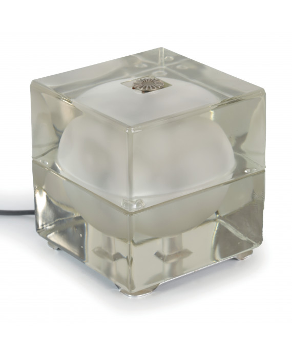 Alessandro Mendini (1931-2019). Lampada da tavolo, modello Cubosfera, in vetro trasparente e satinato con supporto in metallo. Produzione Fidenza vetraria, 1968. cm17x16x16