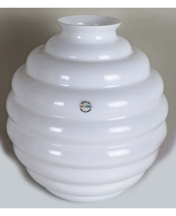 Vaso in vetro lattimo di Murano, modello Deco, firmato sul fondo Venini 2009. Alt. cm29