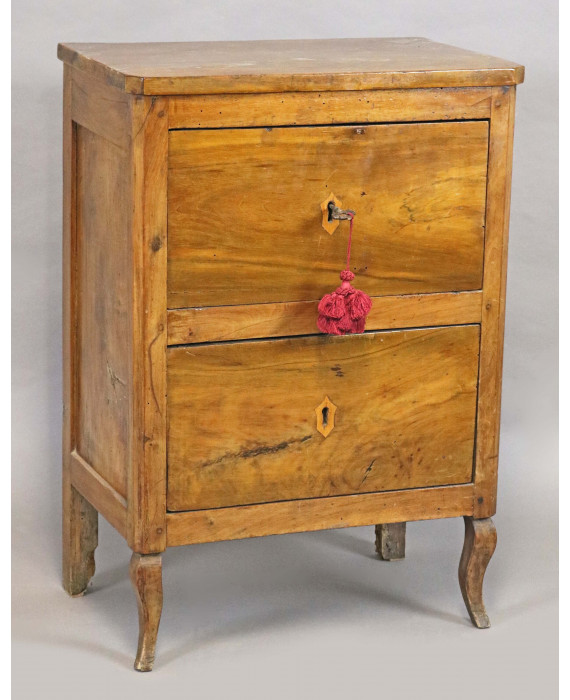 Mobiletto a due cassetti in legno di noce con sostegni anteriori mossi. Italia, sec. XIX. cm78x54x34