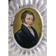 Coppia di specchierine ovali incise con serti vegetali e fiori, con miniature centrali dipinte raffiguranti gentiluomo e gentildonna, con cornice in legno dorato. cm36x30