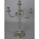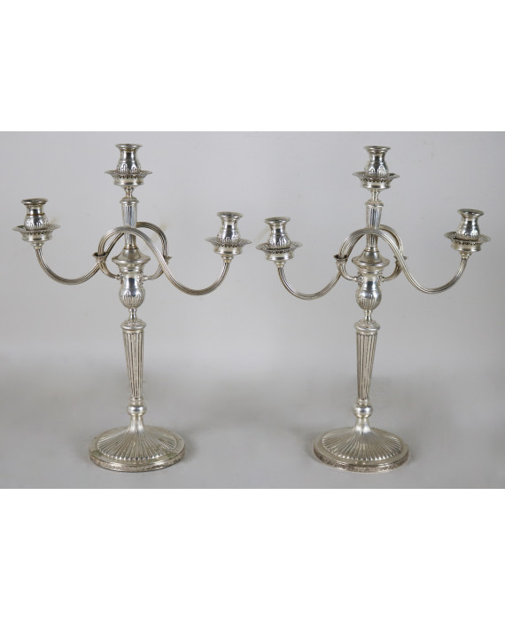 Coppia di candelabri a tre fiamme in argento 800, con corpo baccellato, base incisa a palmette e bracci a voluta. Alt. cm43. Peso tot. gr. 1970