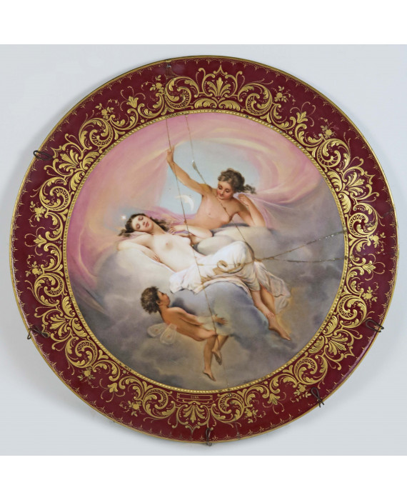 Piatto da parata in porcellana con tesa decorata a volute in oro e centrale dipinto con allegoria della Luna, firmato in basso Juger e marcato sul retro Vienna. Austria, sec. XIX. Diam. cm49 (piatto restaurato anticamente con grappe in metallo)