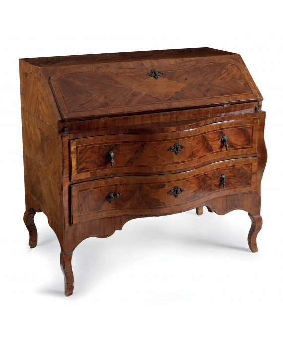 Ribalta lastronata in legno di ciliegio con filettature in legni chiari, calatoia con all'interno quattro cassettini e vano a giorno centrale, due cassetti, fronte e gambe mosse. Italia, sec. XVIII. cm103x114x65 (mancanze)