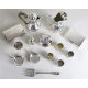 Lotto di 14 oggetti in argento 800: una caraffa, una caffettiera con manico in legno, 4 porta tovaglioli, un bicchiere, due pentoline, una zuccheriera, un forchettone e due scatole con rivestimento interno in legno. Peso tot. gr 1710 (escluse le due scatole)
