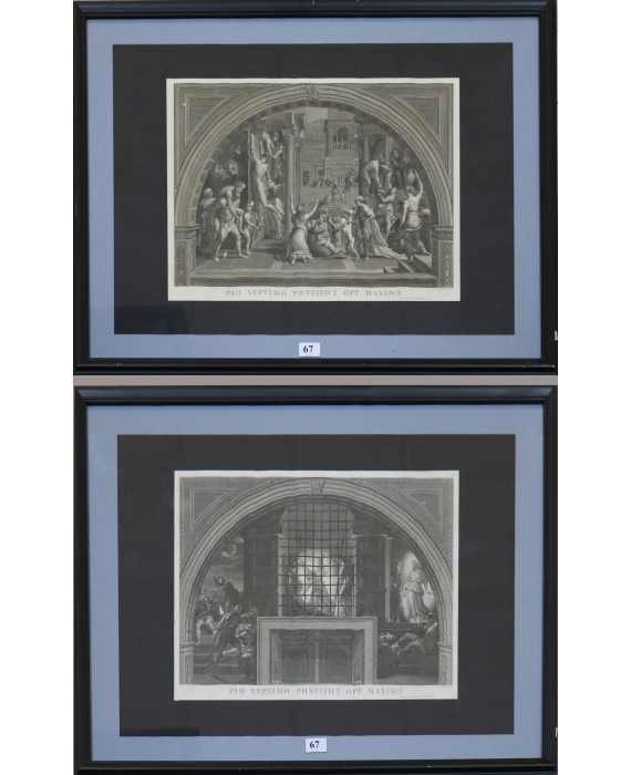 Coppia di incisioni: Raffaello Sanzio dipinse - P. Chigi incise. La liberazione di San Pietro e l'incendio di Borgo, con cornici