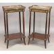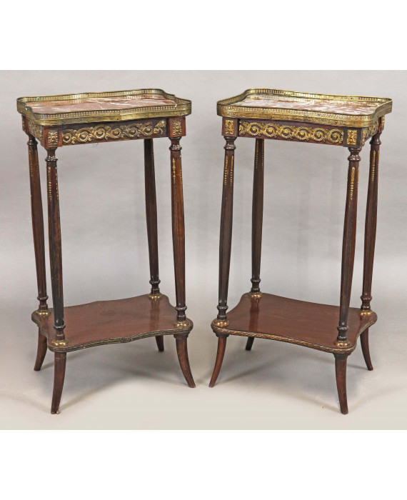 Lotto di due altane similari impiallacciate in legno di mogano, quattro colonnine raccordate da piano inferiore, applicazioni in metallo dorato, ringhierina superiore e piani in marmo. Francia, fine sec. XIX. Alt. cm77x40x30