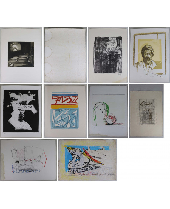 Lotto di dieci grafiche: Walter Valentini. La porta del tempo. Acquaforte su carta, es. n. 9/100, firma in basso a destra. Piero Guccione. Volto femminile, '69. Litografia policroma, es. n. 34/65, firma e data in basso a destra, timbro a secco il Torcoliere (macchie nel perimetro inferiore). Umberto Mastroianni. Composizione. Acquaforte su carta, es. n. 100/100, firma in basso a destra. Sandro Trotti. Figura distesa. Esemplare unico ritoccato a pastello, firma e dedica ad personam in basso. Giuseppe De Gregorio. Composizione, '63. Stampa su carta, firma e data in basso a destra. C. Galante. Beduino. Litografia su carta, es. n. V/X, firma e timbro della stamperia Farina Serigrafia in basso a destra. ugo Attardi. Nudo disteso, '68. Litografia su carta, es. n. IX/X, firma e data in basso a destra (macchie al perimetro laterale). Mario Ceroli. Figura, '71. Litografia su carta, es. 96/110, firma e data in basso a destra (macchie al supporto). Riccardo Licata. Mare-sole-riflessi, '84. litografia policroma su carta, es. n. 26/100, firma, data e titolo in basso. Artista del sec. XX. Scena d'interno con figura, '76. Acquaforte su carta, es. n. 4/20, firma e data in basso a destra.