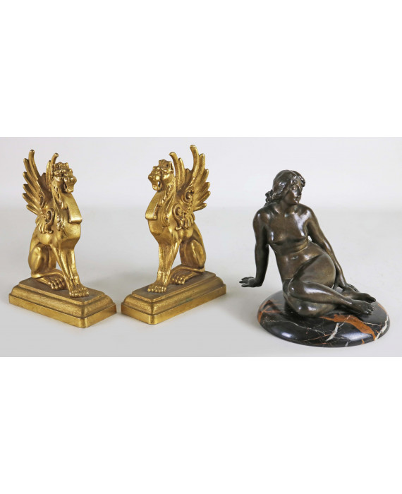 Lotto di una fusione in bronzo brunito raffigurante nudo di donna sdraiato su base a calotta in marmo ed una coppia di fermalibri a forma di leoni alati, in bronzo dorato. Alt. cm22; 26(2)