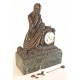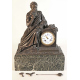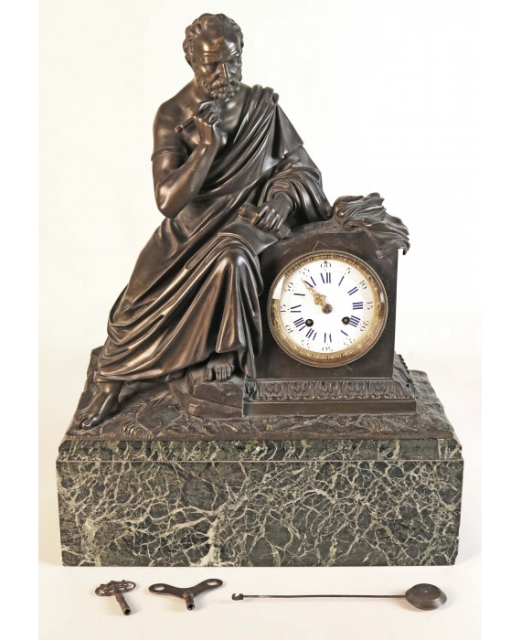 Orologio da tavolo con base in marmo verde e statuina superiore in bronzo patinato raffigurante Ippocrate, quadrante in smalto con numeri romani, marcato sul meccanismo Japy Frères Medailles d'or 1823. Francia, sec. XIX. cm55x41x19 (mancanza sullo sportellino posteriore e da revisionare)