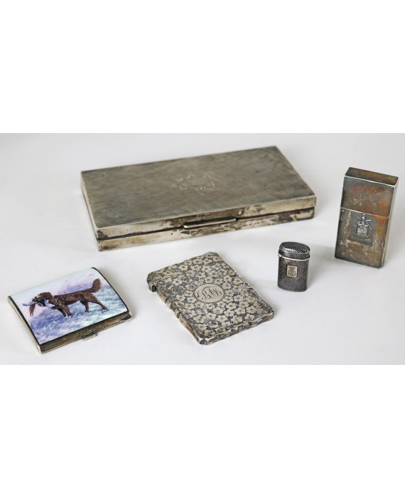 Lotto di cinque scatole in argento: una con coperchio in smalto raffigurante cane da caccia, una incisa a fiori con bolli Birmingham del 1897-1898, una con bolli 800 e stemma con cimiero in rilievo, una porta accendino con bolli Francia ed una con bolli 800 e rivestimento interno in legno. Peso tot., esclusa scatola con rivestimento interno in legno, gr. 250