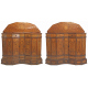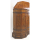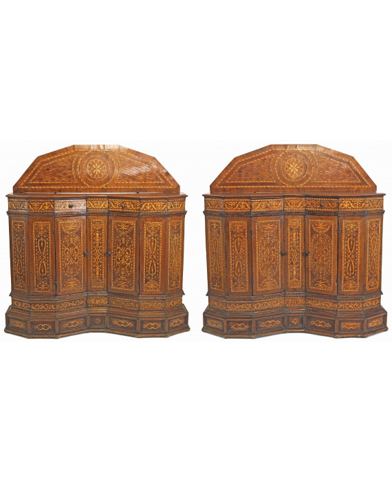 Coppia di credenze scantonate in legno di ciliegio, interamente intarsiate a volute vegetali, due cassettini superiori, due sportelli inferiori. Italia, inizi sec. XX. cm150x152x37 (difetii)