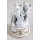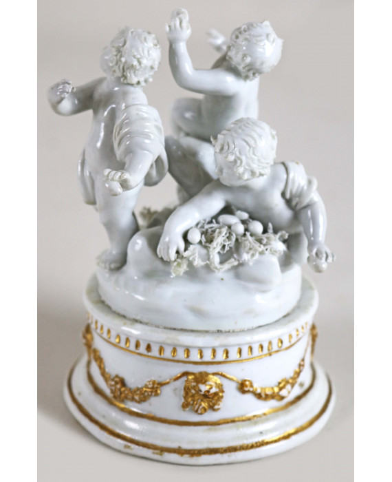 Gruppo in porcellana bianca del sec. XVIII, raffigurante tre putti che raccolgono uova, su base circolare lavorata a rilievo e decorata in oro. Alt. tot. cm13 (base non pertinente e lievi mancanze)