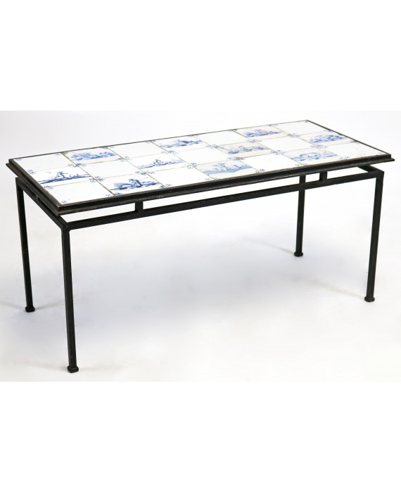 Tavolinetto con struttura in ferro e piano rivestito con antiche mattonelle di Delft dipinte in blu con personaggi animali e architetture. cm43x93x41 (lievi difetti)
