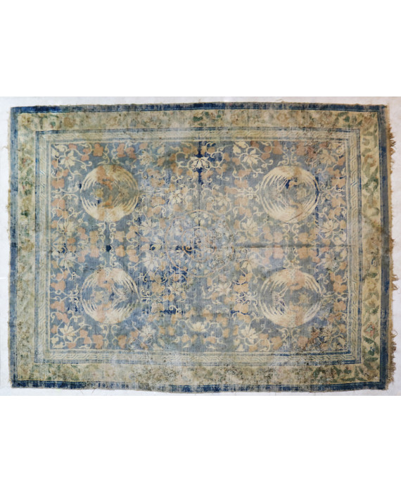 Tappeto ad ornati floreali e tondi con paradisee. Cina, fine sec. XIX. cm290x230 (tappeto rapè da restaurare)