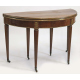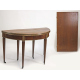 Tavolo allungabile a mezza luna in legno di ciliegio con apertura a libro, cornici in metallo dorato, sei gambe coniche, completo di una prolunga. Francia, fine sec. XIX. cm75x114x55 (difetti al piano)