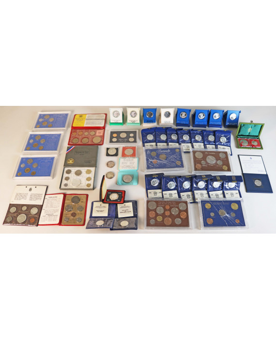 Lotto di 12 divisionali esteri e numerose monete e medaglie commemorative, complete di custodie. Peso tot. dell'argento, gr. 490 (difetti ad alcune custodie e tre monete senza custodia)